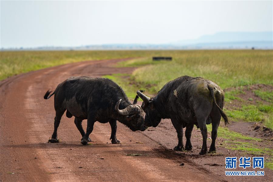 6月17日,在肯尼亚马赛马拉国家保护区,两头水牛在打斗。 新华社记者 李琰 摄