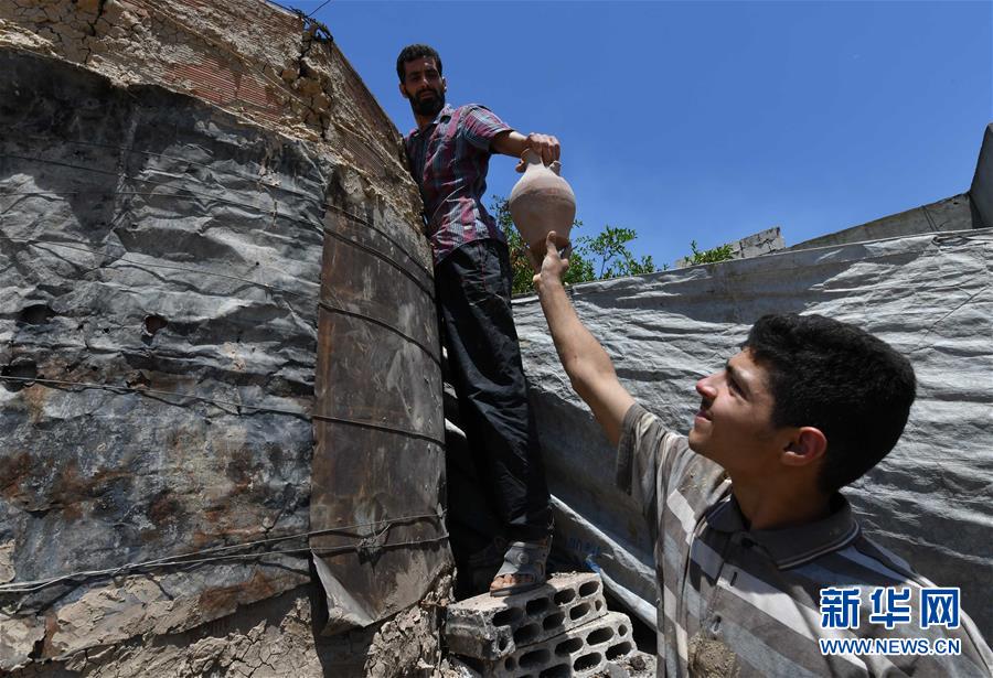 6月5日,在叙利亚霍姆斯,扎卡莱亚·卡尔库什(左)与儿子在作坊外工作。 新华社发(阿马尔摄)