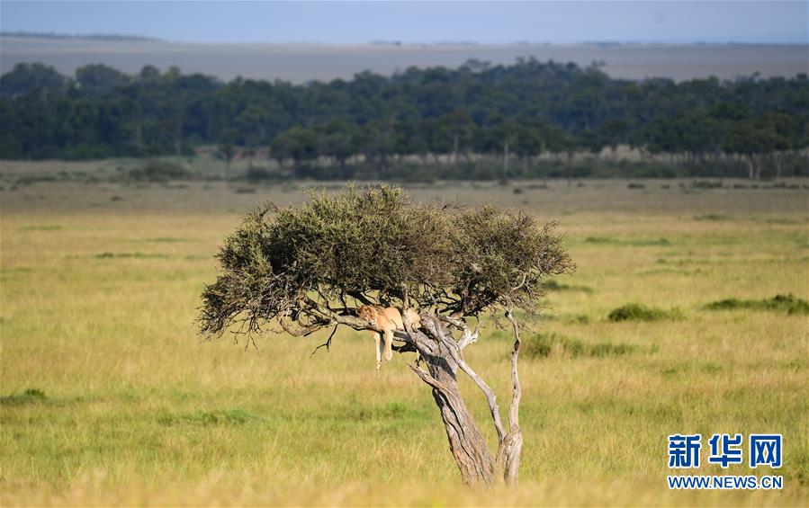 6月17日,在肯尼亚马赛马拉国家保护区,一头狮子在树上休息。 新华社记者 李琰 摄