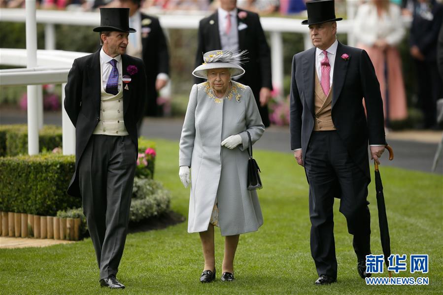 6月20日,在英国阿斯科特,英国女王伊丽莎白二世(中)出席皇家阿斯科特赛马会。 当日是英国皇家阿斯科特赛马会“女士日”。在这一天,女士们会戴上各式各样的华丽礼帽观看赛马。 新华社发(蒂姆·爱尔兰摄)