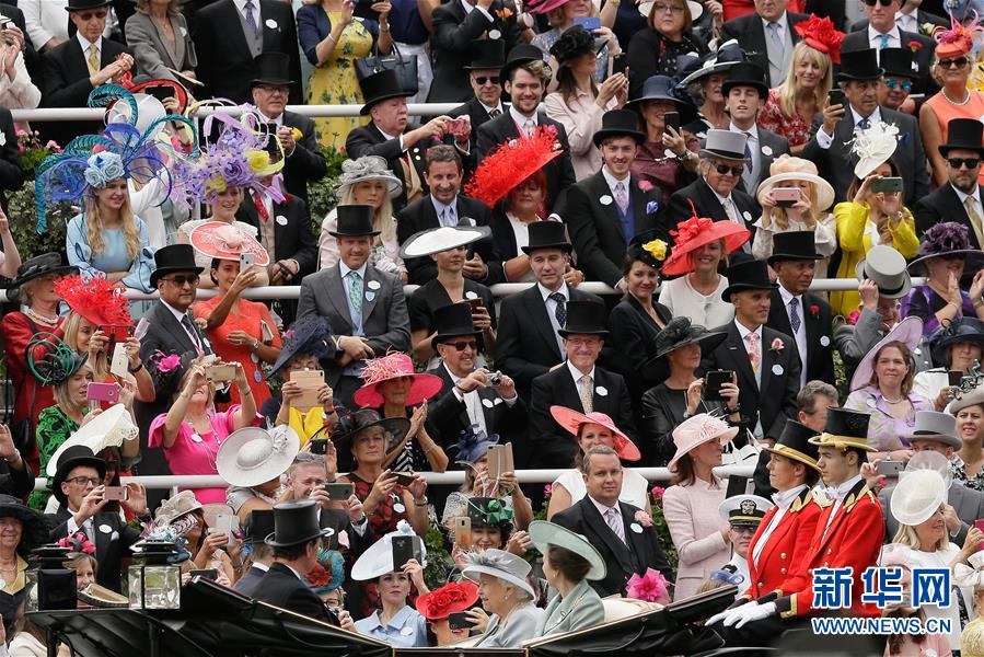 6月20日,在英国阿斯科特,英国女王伊丽莎白二世(前排右四)出席皇家阿斯科特赛马会。 当日是英国皇家阿斯科特赛马会“女士日”。在这一天,女士们会戴上各式各样的华丽礼帽观看赛马。 新华社发(蒂姆·爱尔兰摄)