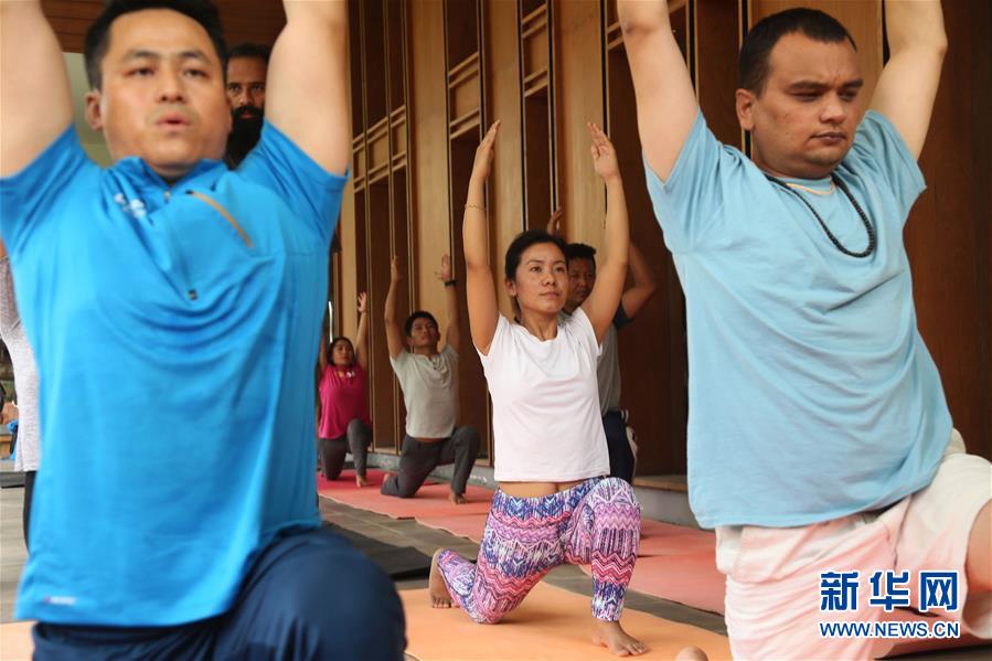 6月21日,在尼泊尔加德满都,人们参与集体瑜伽活动,共同庆祝国际瑜伽日。每年的6月21日被联合国大会定为国际瑜伽日。新华社发(苏尼尔·夏尔马摄)