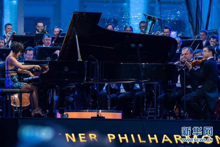 6月20日,在奥地利维也纳,中国钢琴家王羽佳(前左)在2019维也纳美泉宫夏夜音乐会上演奏。2019年奥地利维也纳夏夜露天音乐会20日晚在世界文化遗产美泉宫上演。夏夜音乐会是维也纳每年夏季的一大文化盛事,吸引了大批观众前来。新华社记者 郭晨 摄