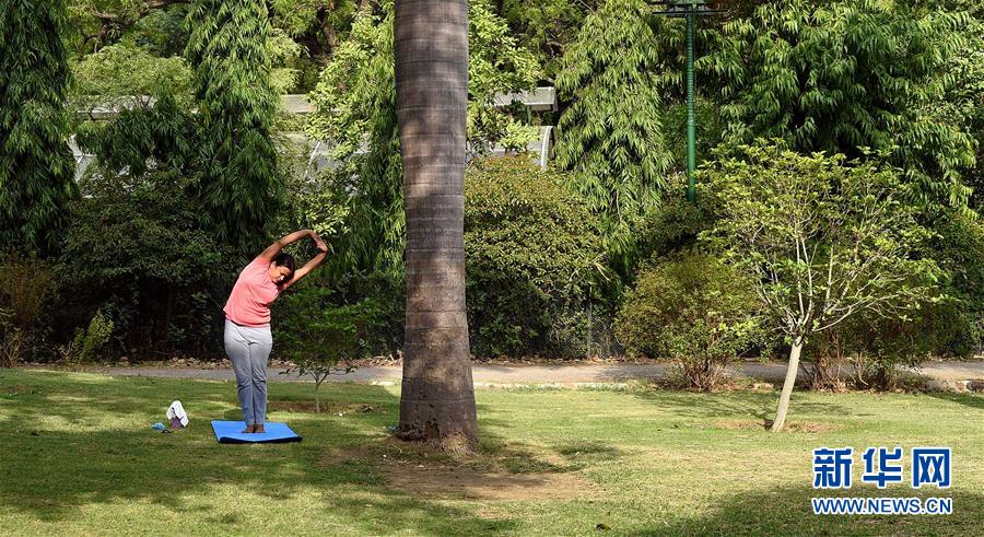 6月21日,在印度新德里,一名女子在公园练习瑜伽。 每年的6月21日被联合国大会定为国际瑜伽日。 新华社记者张迺杰摄