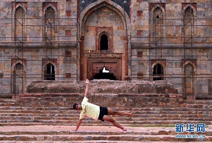 6月21日,在印度新德里,一名男子练习瑜伽。 每年的6月21日被联合国大会定为国际瑜伽日。 新华社记者张迺杰摄