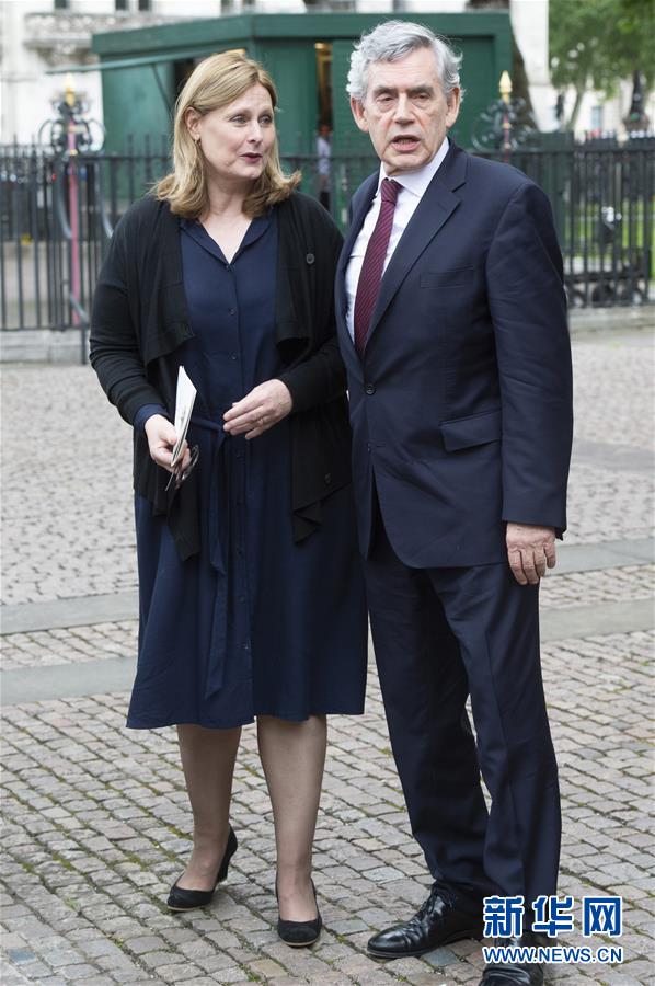 6月20日,在英国伦敦,英国前首相布朗与夫人在感恩悼念活动结束后离开威斯敏斯特教堂。 新华社发(雷伊·唐摄)