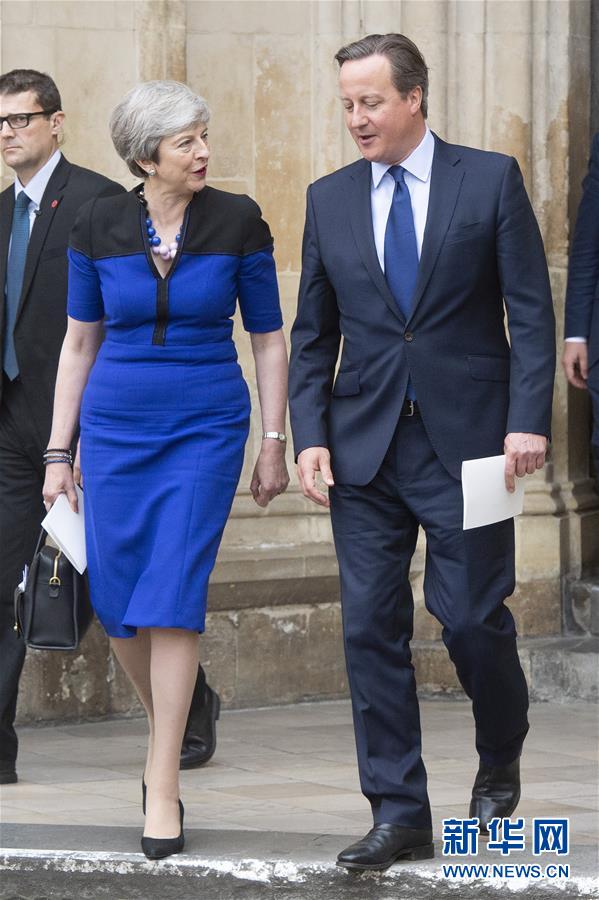 6月20日,在英国伦敦,英国首相特雷莎·梅(左)与前首相卡梅伦在感恩悼念活动结束后离开威斯敏斯特教堂。 新华社发(雷伊·唐摄)