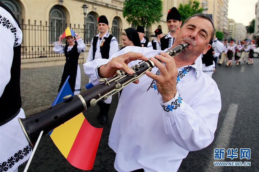 6月21日,艺术家在参加罗马尼亚国际民间音乐和传统艺术节开幕式。 6月21日,罗马尼亚国际民间音乐和传统艺术节在罗马尼亚首都布加勒斯特开幕,吸引了罗马尼亚、塞尔维亚、黑山、马其顿和中国等国家和地区的艺术家参加。 新华社发(克里斯泰尔 摄)