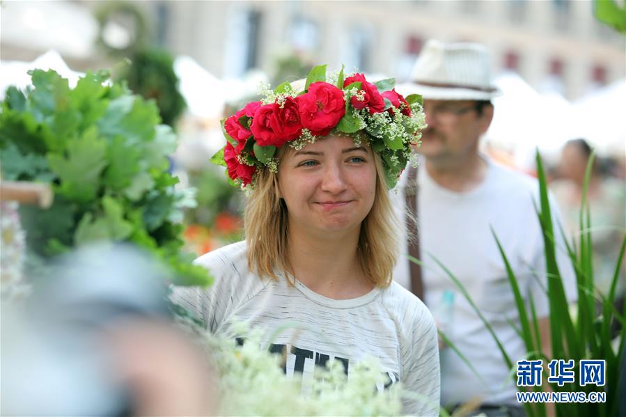 6月21日,在拉脱维亚首都里加的多姆广场,一名女子头戴花环。 当日,一年一度的仲夏节集市在里加的多姆广场举办。人们在集市上购买乡村面包、奶酪、传统茶、蜂蜜、手工糕点、熏肉等农家特色产品,以及象征幸福安康的鲜花、花环等。 新华社发(艾迪斯·帕伦斯摄)