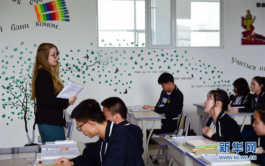 在珲春市职业高中,塔尼亚(左一)与学生使用俄语交流(6月23日摄)。 新华社记者 林宏 摄