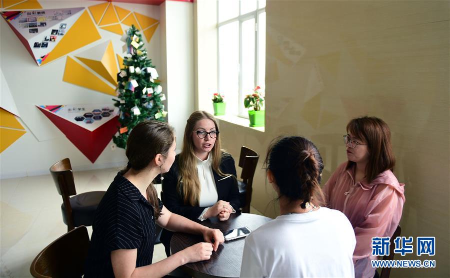 塔尼亚(左二)和同事在珲春市职业高中的教师休息区聊天(6月23日摄)。 新华社记者 林宏 摄