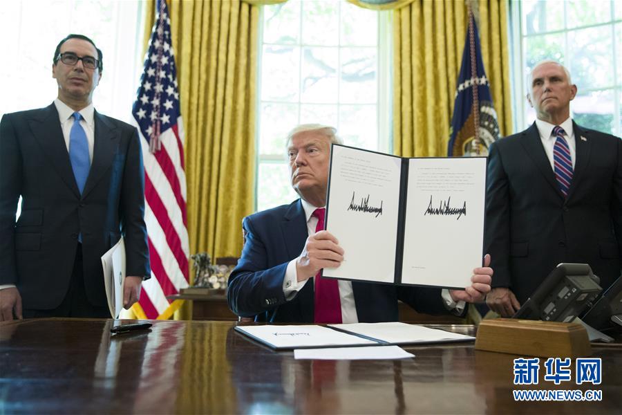 6月24日,在美国华盛顿白宫,美国总统特朗普(中)在椭圆形办公室展示签署的行政令。 美国总统特朗普24日签署行政令,对伊朗最高领袖哈梅内伊及其领导下的机构实施制裁。特朗普当天在白宫签署行政令时表示,此次制裁是对包括击落美国无人机在内的伊朗近期一系列行为的回应,伊朗最高领袖应对伊朗这些“敌对行为”负责。此次制裁将切断哈梅内伊、最高领袖办公室及相关人员的重要财政来源。 新华社/美联