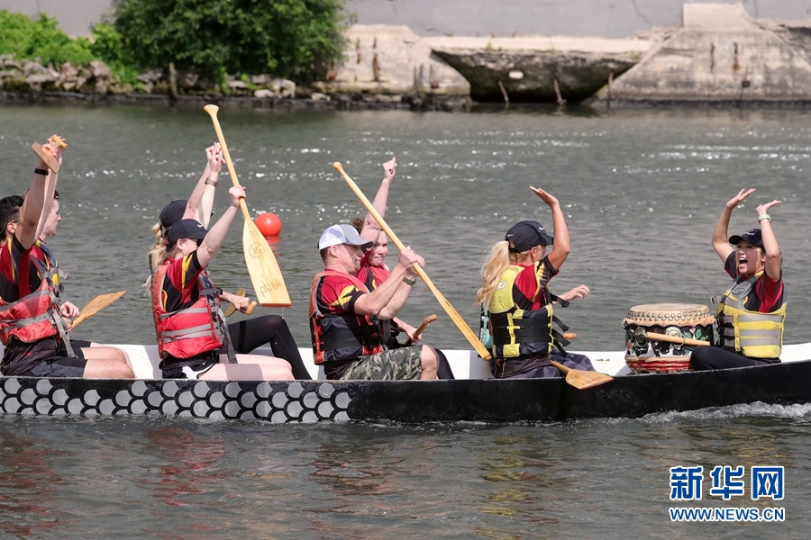 6月22日,由芝加哥华商会举办的第19届芝加哥龙舟赛在中国城谭继平公园举行,这是参赛的队员在比赛。记者 汪平 摄