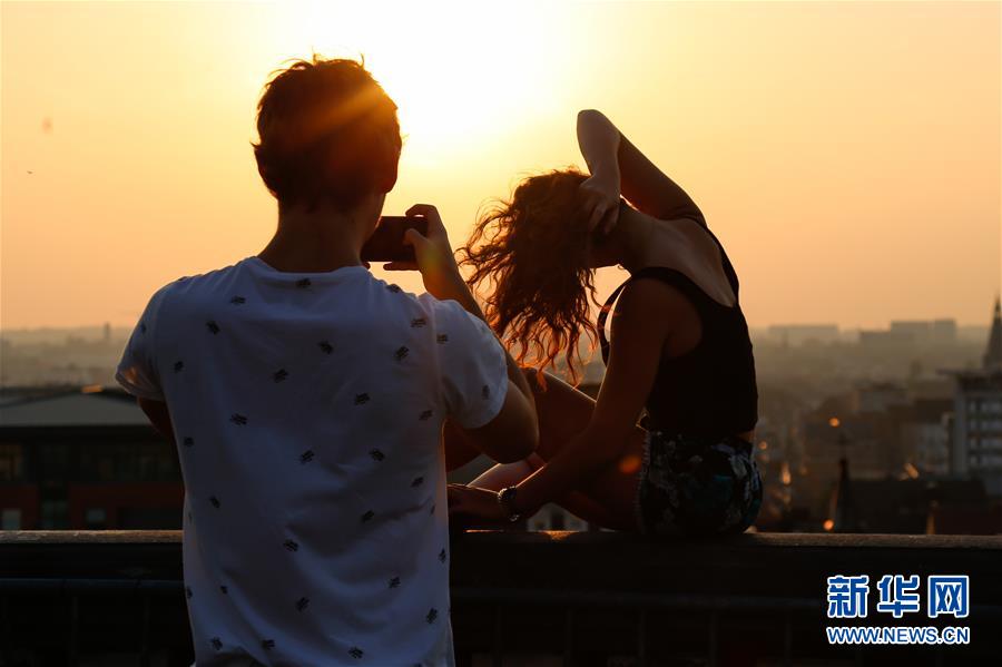 6月25日,在比利时首都布鲁塞尔,游客们在夕阳下拍照留念。 气象学家说,从撒哈拉沙漠吹来的热风把炎热天气带到欧洲。比利时、瑞士和德国等欧洲国家面临高温炙烤。 新华社记者 张铖 摄