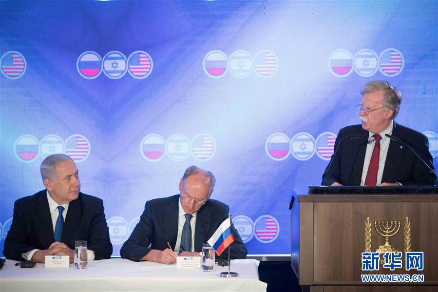 6月25日,(从左至右)以色列总理内塔尼亚胡、俄罗斯联邦安全会议秘书帕特鲁舍夫和美国总统国家安全事务助理约翰·博尔顿在耶路撒冷出席会晤。 俄罗斯、美国和以色列三国25日在耶路撒冷举行会晤,主要讨论伊朗在叙利亚的军事存在问题。由于三方立场大相径庭,会议没有达成任何协议或共识。 新华社/基尼图片社