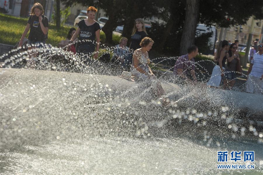 6月26日,人们在奥地利维也纳施瓦岑贝格广场喷泉边消暑。 当日,维也纳最高气温达到36摄氏度,不少居民来到喷泉和水雾喷洒设施旁降温消暑。 新华社记者 郭晨 摄