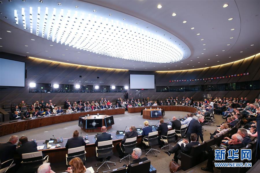 这是6月26日在比利时布鲁塞尔的北约总部拍摄的北约国防部长会议现场。 当日,北约国防部长会议在位于布鲁塞尔的北约总部举行。 新华社记者张铖摄