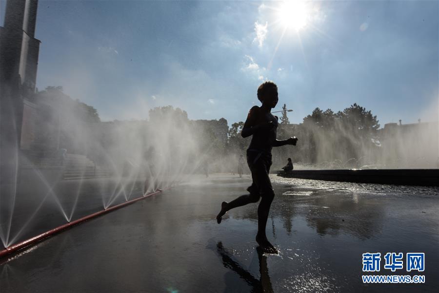 6月26日,一名儿童在奥地利维也纳施瓦岑贝格广场戏水消暑。 当日,维也纳最高气温达到36摄氏度,不少居民来到喷泉和水雾喷洒设施旁降温消暑。 新华社记者 郭晨 摄