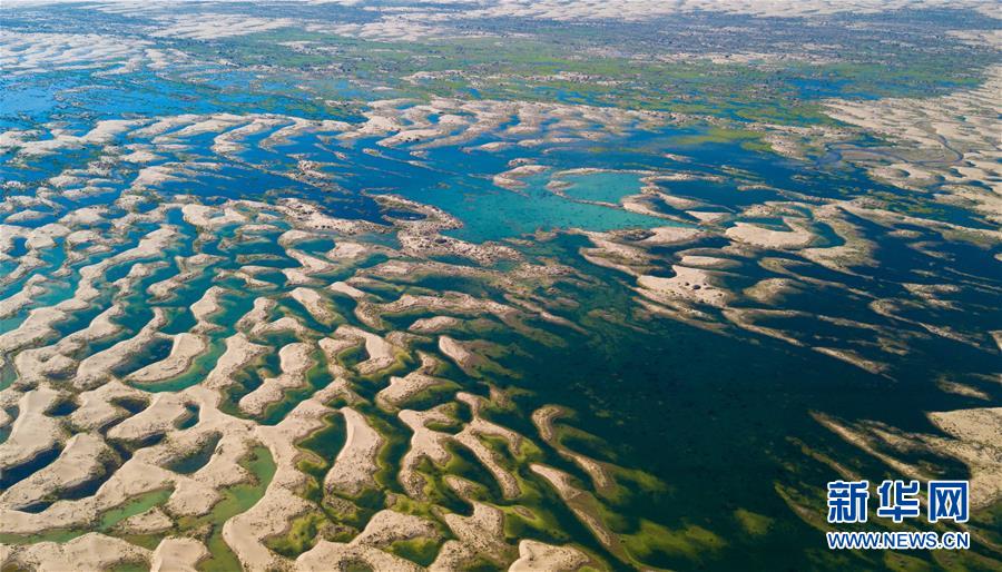 这是库布其沙漠中利用黄河分凌减灾的水进行沙漠生态修复形成的沙漠湿地景色(2018年6月9日无人机拍摄)。 新华社记者 彭源 摄