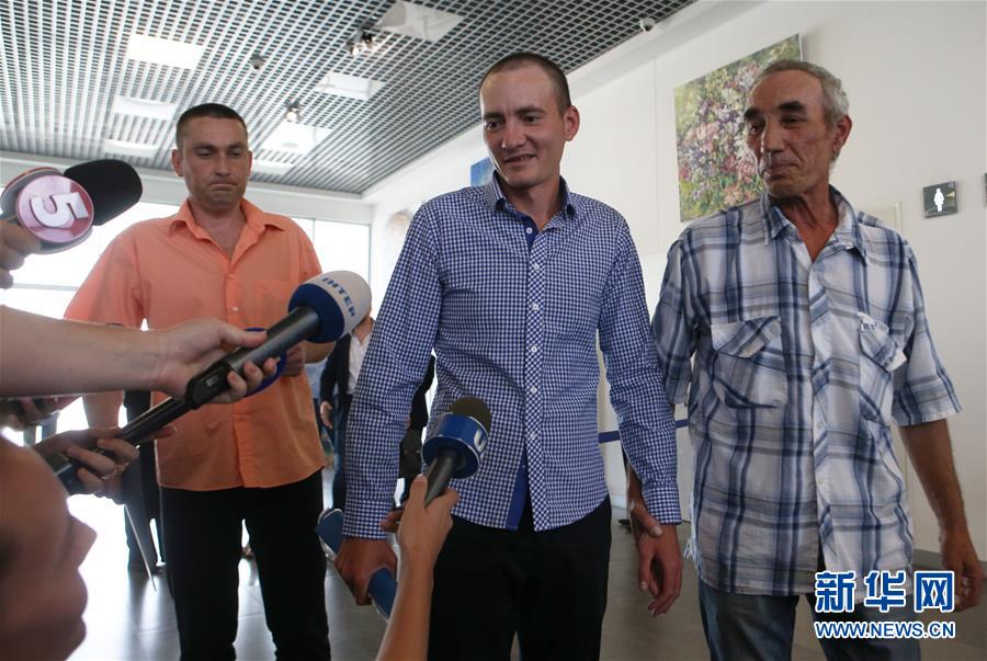 6月28日,在乌克兰首都基辅市,被解救的人质抵达基辅国际机场。 乌克兰东部民间武装28日释放4名在押人员,其中包括3名乌克兰军人和1名乌平民。据乌克兰国际文传电讯社报道,获释人员交接仪式当天在白俄罗斯首都明斯克举行,4人随后乘飞机抵达乌克兰首都基辅。 新华社发(谢尔盖摄)
