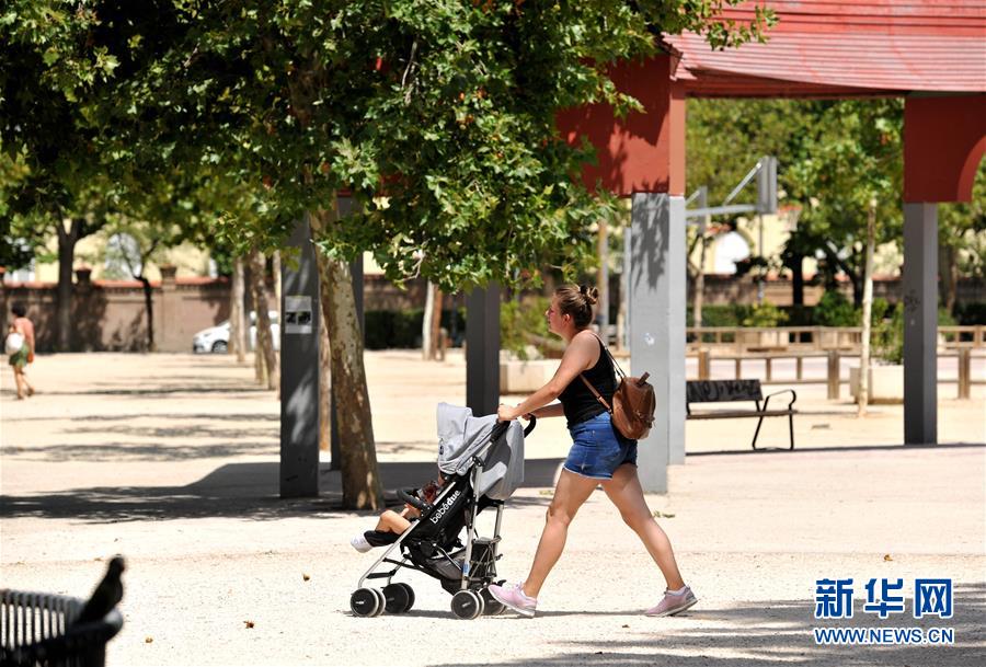 6月28日,一名女子带着孩子行走在西班牙马德里一处公园内。 6月28日,西班牙马德里迎来高温酷暑天气,最高气温达到41摄氏度左右。 新华社记者 郭求达 摄