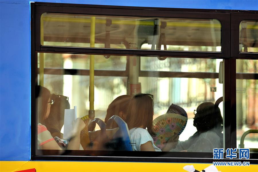 6月28日,西班牙马德里一辆公交车内的乘客用扇子扇风消暑。 6月28日,西班牙马德里迎来高温酷暑天气,最高气温达到41摄氏度左右。 新华社记者 郭求达 摄