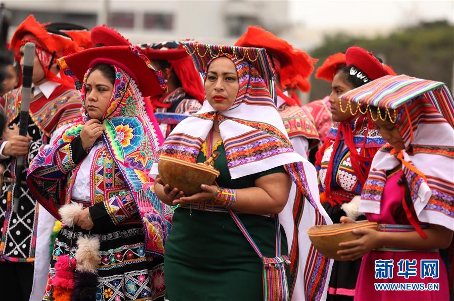 6月28日,在秘鲁首都利马,人们身穿传统服装参加“太阳节”活动。 “太阳节”是秘鲁的传统节日,起源于古印加帝国。古印加人自称为“太阳的子孙”,秘鲁人在每年6月祭祀太阳神,感谢上一年的保佑并祈祷来年的丰收。 新华社发(玛利亚娜·巴索摄)