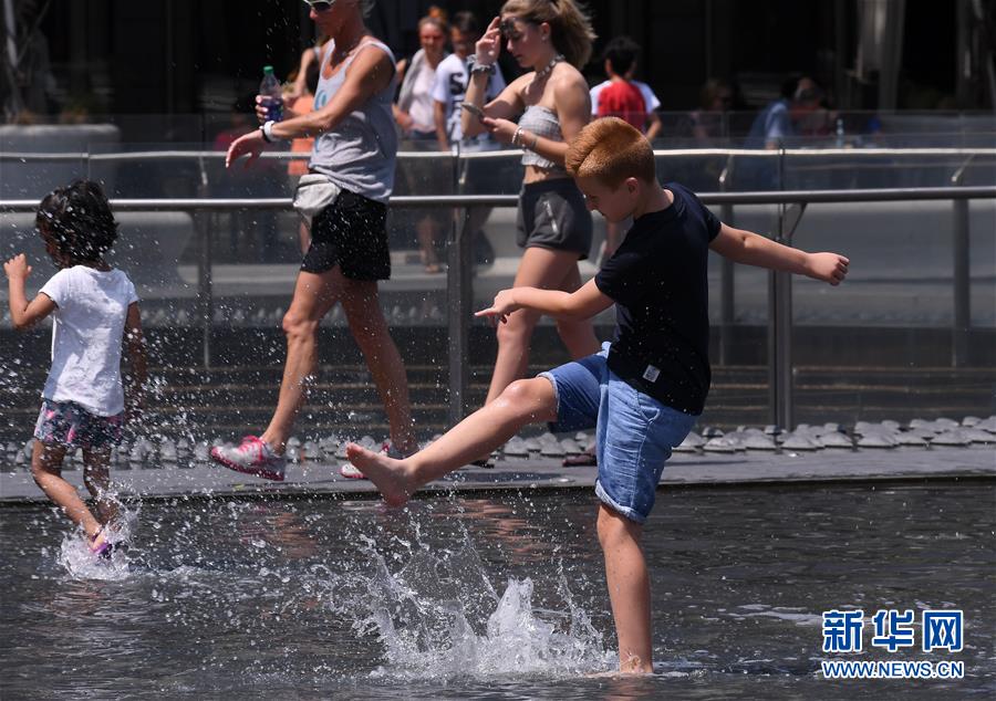 6月29日,在意大利米兰,人们在喷泉池里纳凉。新华社发(阿尔贝托·林格里亚摄)