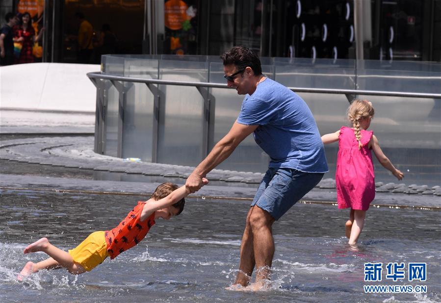 6月29日,在意大利米兰,人们在喷泉池里纳凉。新华社发(阿尔贝托·林格里亚摄)