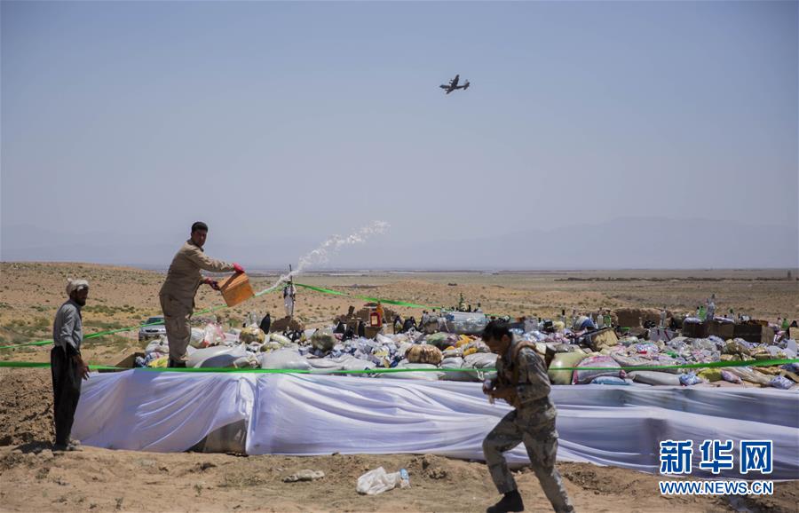6月30日,在阿富汗西部的赫拉特省,阿安全部队士兵准备销毁毒品。 据阿富汗政府官员30日称,阿西部赫拉特省当天销毁了30吨收缴的毒品。 新华社发(埃拉哈·萨希尔 摄)