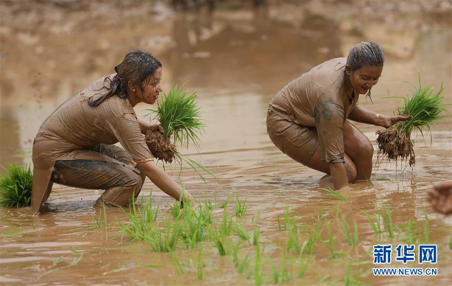 6月30日,在尼泊尔塔丁,人们在一处稻田里插秧。 当日是尼泊尔的阿萨尔潘德拉节,即“全国水稻日”,标志着水稻种植季的开始。尼泊尔民众以在稻田里“滚泥巴”沾得满身泥泞的方式来庆祝这一节日,预祝丰收。 新华社发(苏尼尔·夏尔马摄)