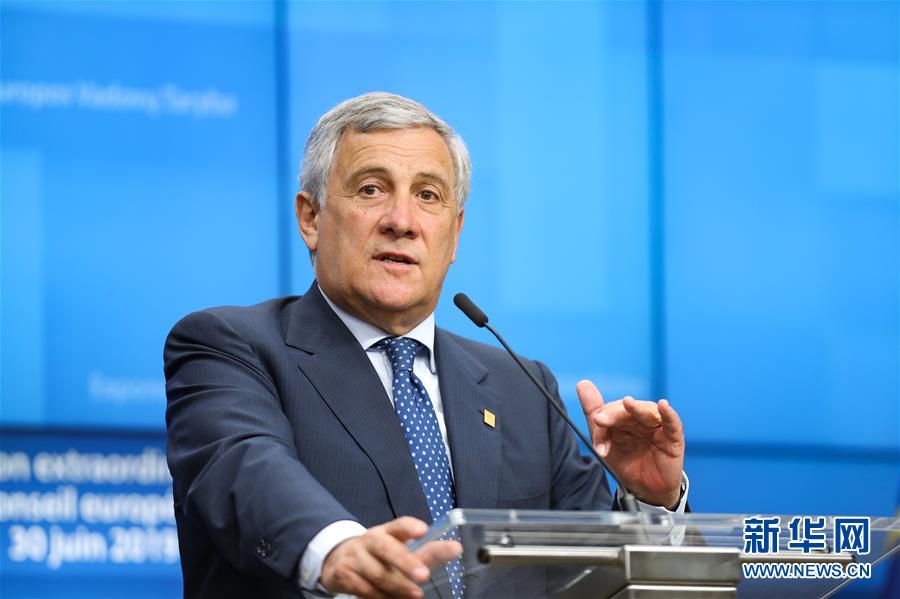 6月30日,在位于比利时布鲁塞尔的欧盟总部,欧洲议会议长塔亚尼出席新闻发布会。 欧盟6月30日在布鲁塞尔召开峰会,磋商欧盟机构领导人换届人选等问题。 新华社记者张铖摄