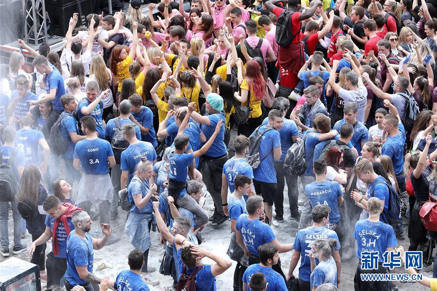 5月22日,在克罗地亚首都萨格勒布,高中毕业生参加“疯狂日”活动。 新华社发(马切克摄)
