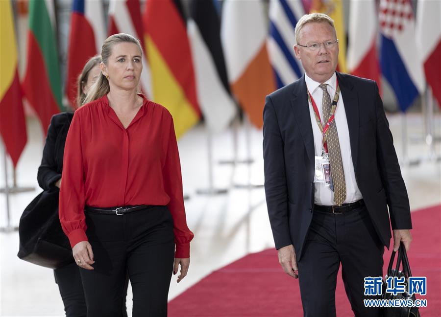 7月2日,在位于比利时布鲁塞尔的欧盟总部,丹麦首相梅特·弗雷泽里克森(左)准备出席欧盟峰会。新华社发(莫纳斯摄)