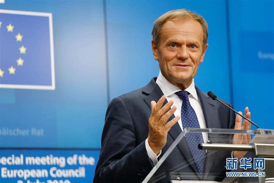 7月2日,在位于比利时布鲁塞尔的欧盟总部,欧洲理事会主席图斯克在欧盟峰会后出席新闻发布会。新华社发(欧盟供图)