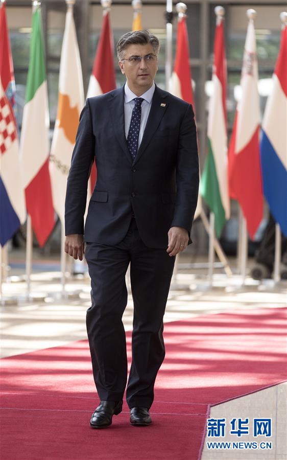 7月2日,在位于比利时布鲁塞尔的欧盟总部,克罗地亚总理普连科维奇准备出席欧盟峰会。新华社发(莫纳斯摄)