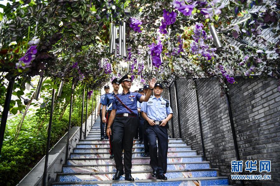 7月2日,中意联合巡逻小组的警员在重庆市南岸区弹子石老街巡逻。 日前,来自意大利的两名警员与重庆公安民警在重庆开展为期10天的联合巡逻。联合巡逻小组采取步巡、车巡相结合的方式,在解放碑步行街、洪崖洞、江北机场等热门旅游景区和人员密集场所进行联合巡逻。从6月24日至7月5日,意大利警方共派出8名警员来华,在北京、上海、重庆、广州4个城市与中国公安民警开展联合巡逻。 新华社记者 刘潺 摄