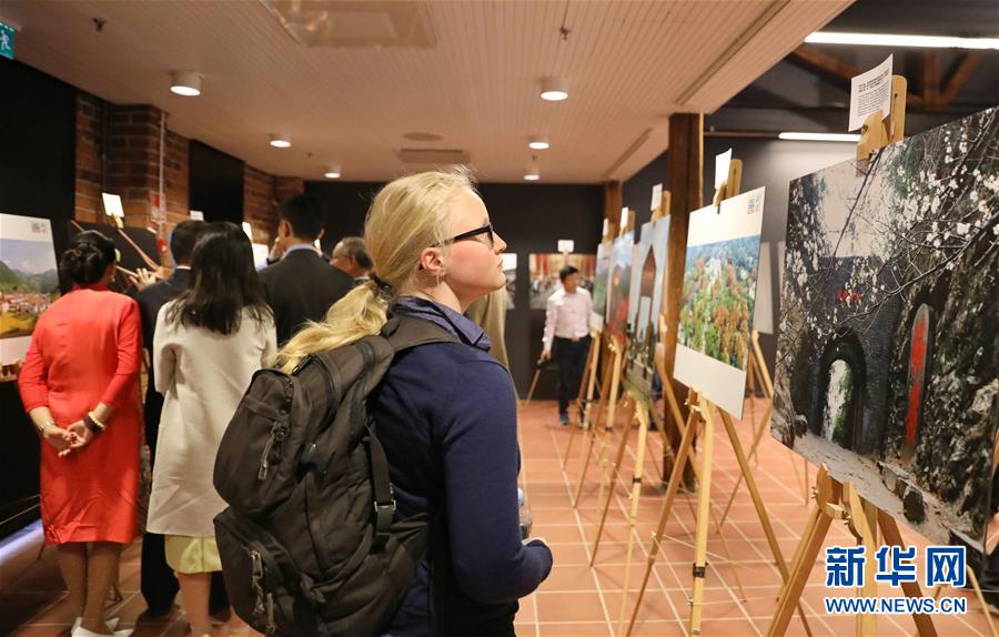 7月2日,在芬兰首都赫尔辛基,参观者欣赏介绍韶关旅游资源的图片。 “岭南名郡·善美韶关——中国韶关文化旅游图片展”2日在芬兰首都赫尔辛基开幕。30余幅精美图片展示了广东省韶关市的自然风光、民俗风情、历史古迹和人文建筑。 新华社记者 李骥志 摄