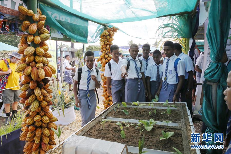 7月4日,在斐济首都苏瓦,学生们参观蔬菜种植展位。 为期3天的2019年斐济全国农业展自3日起在首都苏瓦举行。这次展览旨在宣传斐济的农业服务,展示新产品与新技术,促进农产品生产与私营部门之间的伙伴关系。 新华社记者 张永兴 摄