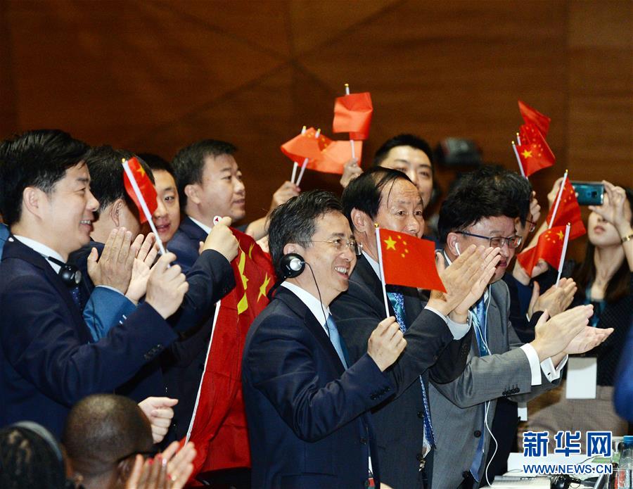 7月6日,在阿塞拜疆巴库,中国代表团在世界遗产大会上庆祝中国良渚古城遗址申遗成功。 中国良渚古城遗址6日在阿塞拜疆巴库举行的世界遗产大会上获准列入世界遗产名录。至此,中国世界遗产总数已达55处,位居世界第一。 新华社发(巴巴耶夫 摄)
