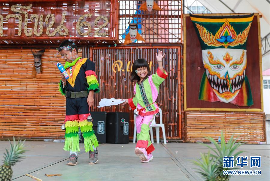 7月6日,在泰国黎府,两名儿童在“鬼面节”庆祝活动上玩耍。每年六七月份,泰国东北地区黎府的丹赛地区都会举行“鬼面节”庆祝活动,人们身着多彩的服装和鬼面,在街上载歌载舞,游行狂欢。新华社记者 张可任 摄