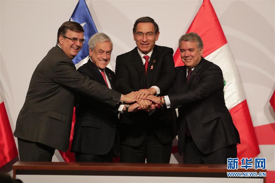 7月6日,在秘鲁首都利马,(从右至左)哥伦比亚总统杜克、秘鲁总统比斯卡拉、智利总统皮涅拉和墨西哥外长埃布拉德出席太平洋联盟首脑峰会。 第14届太平洋联盟首脑峰会6日在秘鲁首都利马举行。会议通过《利马声明》,承诺深化区域经济一体化和维护多边贸易体制。 新华社发(玛利亚娜·巴索摄)
