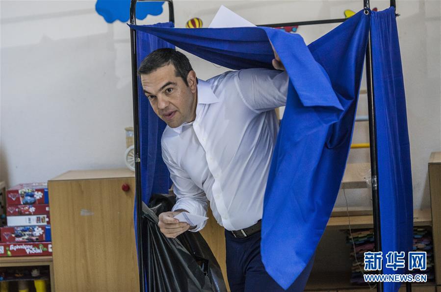 7月7日,在希腊首都雅典,希腊总理亚历克西斯·齐普拉斯在一处投票站准备投票。 希腊7日举行议会选举,各党派角逐300个议席。 新华社发(帕纳约蒂斯摄)