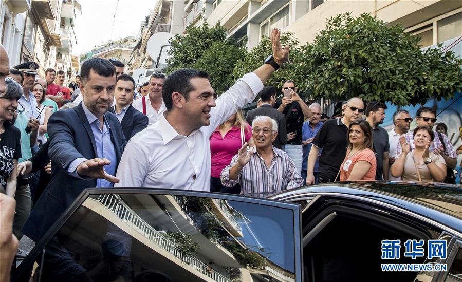 7月7日,在希腊首都雅典,希腊总理亚历克西斯·齐普拉斯(前中)离开一处投票站时向人们招手。 希腊7日举行议会选举,各党派角逐300个议席。 新华社发(帕纳约蒂斯摄)