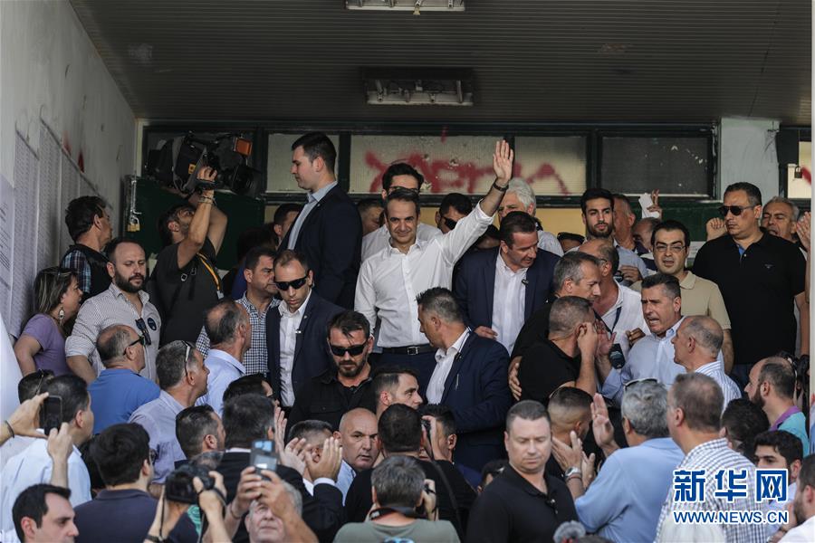 7月7日,在希腊首都雅典,新民主党领导人基里亚科斯·米佐塔基斯(中)离开一处投票站时向人们招手。 希腊7日举行议会选举,各党派角逐300个议席。 新华社发(莱夫泰里斯·帕特萨利斯摄)