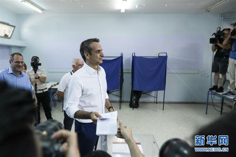7月7日,在希腊首都雅典,新民主党领导人基里亚科斯·米佐塔基斯(中)在一处投票站投票。 希腊7日举行议会选举,各党派角逐300个议席。 新华社发(莱夫泰里斯·帕特萨利斯摄)
