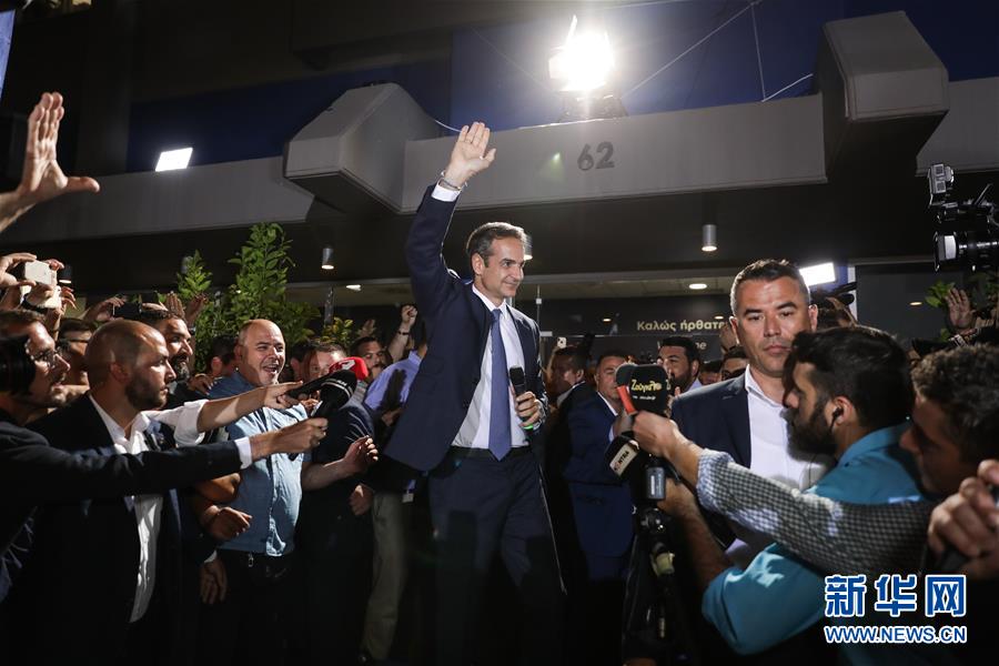 7月7日,在希腊雅典新民主党总部,新民主党领导人基里亚科斯·米佐塔基斯(中)向支持者挥手致意。 希腊7日举行议会选举。根据希腊内政部7日晚间对90%选票的统计结果,希腊主要反对党新民主党赢得选举。 新华社发(莱夫泰里斯·帕特萨利斯摄)