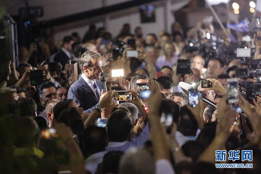 7月7日,在希腊雅典新民主党总部,新民主党领导人基里亚科斯·米佐塔基斯向支持者发表讲话。 希腊7日举行议会选举。根据希腊内政部7日晚间对90%选票的统计结果,希腊主要反对党新民主党赢得选举。 新华社发(莱夫泰里斯·帕特萨利斯摄)