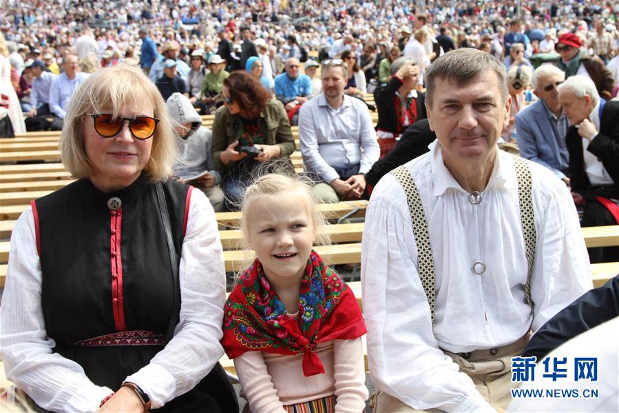 7月7日,在爱沙尼亚首都塔林,爱沙尼亚当选欧洲议会议员、前总理安西普(右一)在歌唱庆典广场参加第27届歌唱庆典“我的祖国,我的爱”主题音乐会。 主题为“我的祖国,我的爱”的大型歌舞庆典活动7日在爱沙尼亚首都塔林落下帷幕。来自爱沙尼亚和其他国家的1700多个合唱团及舞蹈团参加了此次活动,表演者总数达4.7万名。 新华社记者 郭春菊 摄