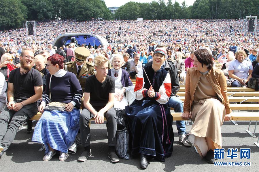 7月7日,在爱沙尼亚首都塔林,爱沙尼亚总统卡柳莱德(右二)在歌唱庆典广场参加第27届歌唱庆典“我的祖国,我的爱”主题音乐会。 主题为“我的祖国,我的爱”的大型歌舞庆典活动7日在爱沙尼亚首都塔林落下帷幕。来自爱沙尼亚和其他国家的1700多个合唱团及舞蹈团参加了此次活动,表演者总数达4.7万名。 新华社记者 郭春菊 摄